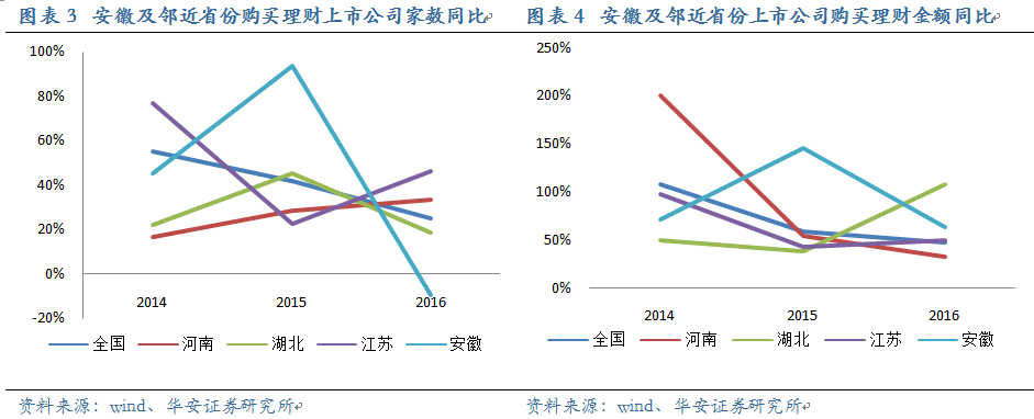 統(tǒng)計上市公司購買理財?shù)脑鏊伲覀儼l(fā)現(xiàn)15、16年安徽的數(shù)據(jù)經(jīng)歷了一個明顯的轉(zhuǎn)折,有異于全國和鄰近省份。無論是購買理財?shù)臄?shù)額還是購買理財公司的家數(shù),15年安徽的增速遠(yuǎn)遠(yuǎn)超過其他省份(數(shù)額增速達(dá)146%,家數(shù)增速達(dá)94%),緊接著16年出現(xiàn)顯著的下滑。