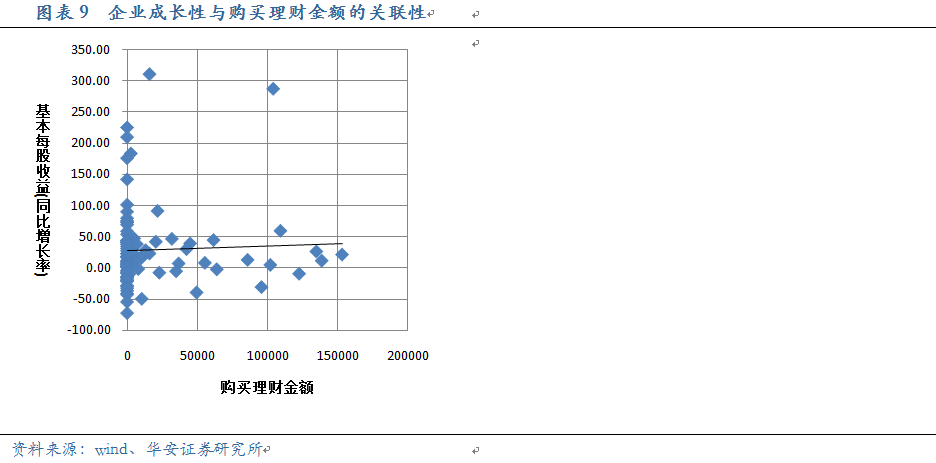 我們考察了上述企業(yè)的主業(yè)的相關(guān)財務(wù)指標(biāo),包括營業(yè)利潤、主營業(yè)務(wù)比率等,發(fā)現(xiàn)每個財務(wù)年度企業(yè)購置理財規(guī)模與當(dāng)期主營業(yè)務(wù)水平之間目前并無明顯聯(lián)系。一方面可能因為統(tǒng)計期限較短,標(biāo)的公司較少;另一方面,《指引2號》限制了企業(yè)購買理財?shù)馁Y金來源及規(guī)模,且只能投向流動性較好、安全性高的理財產(chǎn)品,這意味著作為非主營收入的一部分,大部分公司購置理財對主業(yè)的沖擊有限。