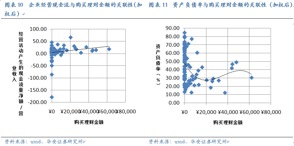 同樣資產(chǎn)負(fù)債率和EBITDA/利息費用的高低也與購買理財關(guān)系不明顯。我們可以理解為企業(yè)的長期償債能力對購買理財?shù)男袨橛绊懞苄?/span>