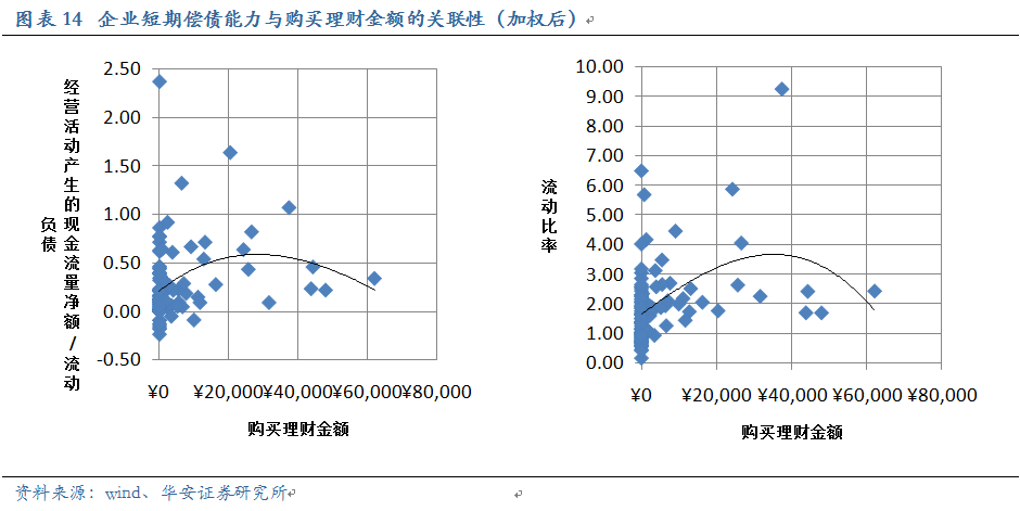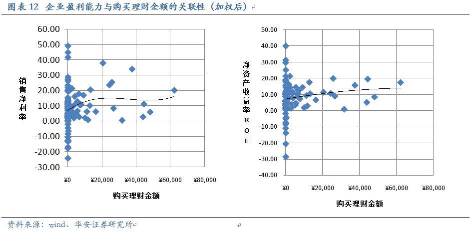 通過和加權(quán)前的數(shù)據(jù)對比,我們發(fā)現(xiàn):加權(quán)前,短期償債能力越強(qiáng)的企業(yè),購置理財?shù)囊?guī)模越大,兩者間存在一定程度的線性關(guān)系;而加權(quán)后,原先比較明顯的線性關(guān)系消失了。那些短期償債能力最強(qiáng)、現(xiàn)金流充沛的公司,加權(quán)后的購置理財規(guī)模并不是最高的,而是居于整體的中間位置。說明這些公司購置理財?shù)漠?dāng)期規(guī)模雖大,但加權(quán)后的規(guī)模屬于適中,即理財?shù)拇胬m(xù)期偏短。這種控制理財期限的方式是值得肯定的。他們放棄了對長端收益率的追求,但獲得的是更多的投資機(jī)會,且在一定程度上避免了利率風(fēng)險。
