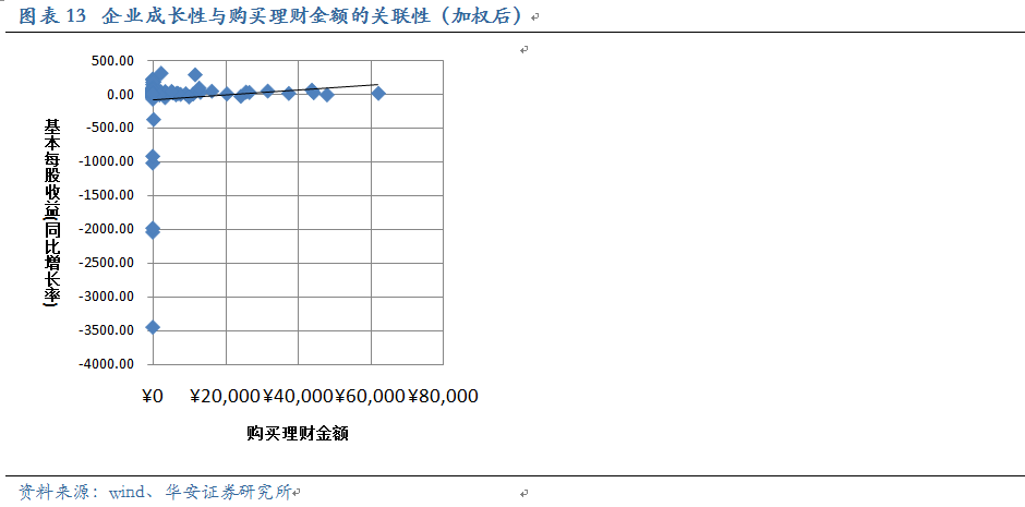 除去個別幾家公司,理財產(chǎn)品對高成長的公司似乎吸引力不大,購買理財?shù)墓敬蠖嗦湓贓PS增長在50%~-50%之間,且這個區(qū)間內(nèi)購買理財規(guī)模與EPS增速沒有明顯的線性關(guān)系。