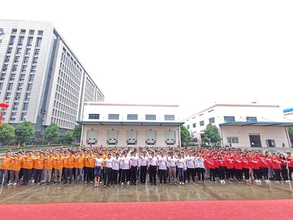 來(lái)自各部門、車間、不同工齡段的員工,身著紅、桔、白三種顏色的文化衫,組成色彩繽紛又整齊劃一的三個(gè)方陣,士氣高昂,氣勢(shì)如虹。