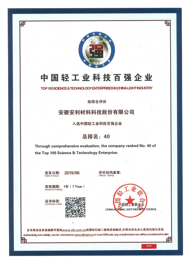 會議發(fā)布了2018年度中國輕工業(yè)百強企業(yè)、中國輕工業(yè)食品行業(yè)50強企業(yè)和中國輕工業(yè)裝備制造30強企業(yè)榜單,并首次發(fā)布了中國輕工業(yè)科技百強企業(yè)名單。安徽安利材料科技股份有限公司憑借良好的自主創(chuàng)新能力,位列中國輕工業(yè)科技百強企業(yè)第40位,是全國聚氨酯合成革行業(yè)唯一一家上榜的企業(yè)。