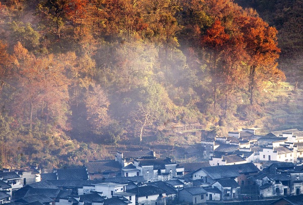 深秋的早晨霧蒙蒙的,那輕紗般的霧隨風飄蕩,便把山籠罩在薄霧之中,云霧繚繞,給山披上了一層神秘的面紗。漫步在山林之中,這種蒙蒙朧朧的感覺,有一種置身于仙境之中的愜意,令人心曠神怡。當一縷縷陽光從山脊灑向晨霧中,晨霧中呈現(xiàn)如流金般的美麗?;张晒琶窬釉诔快F和炊煙中若隱若現(xiàn),與傲霜紅楓交相輝映,宛如夢幻天然畫卷。
