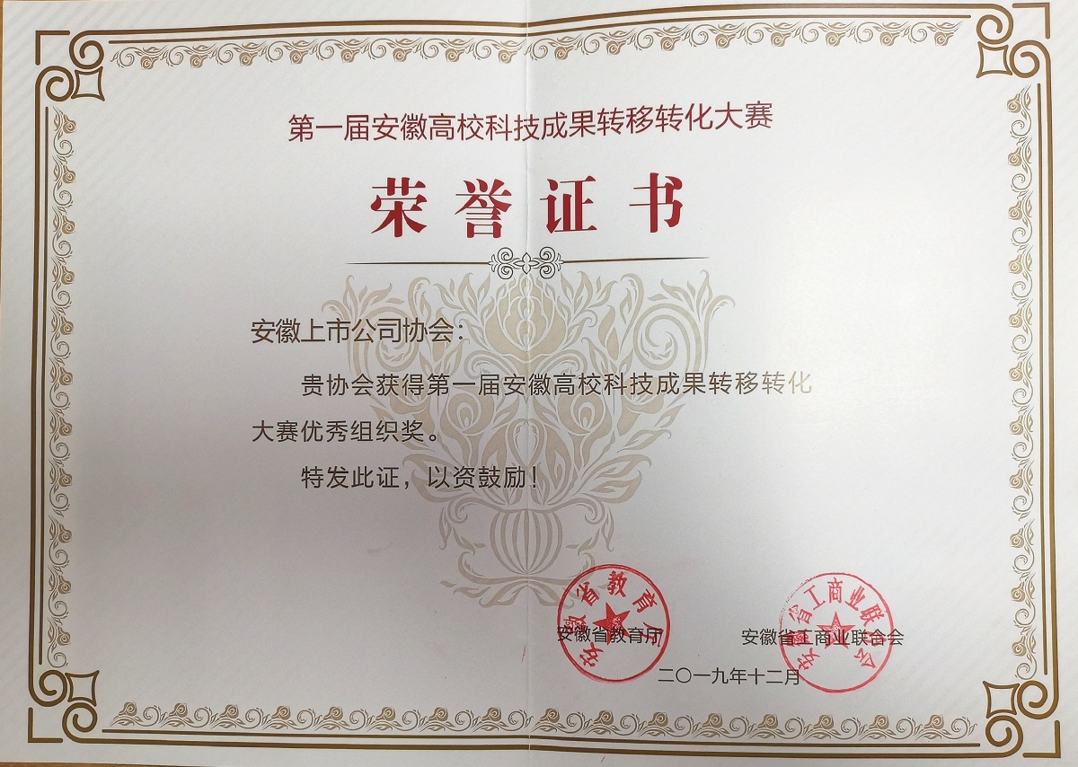 我會榮獲“第一屆安徽高??萍汲晒D(zhuǎn)移轉(zhuǎn)化大賽優(yōu)秀組織獎”榮譽稱號