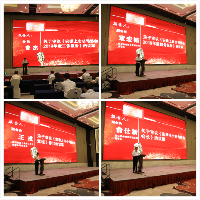 大會(huì)審議并通過了《安徽上市公司協(xié)會(huì)2019年度工作報(bào)告》、《安徽上市公司協(xié)會(huì)2019年度財(cái)務(wù)報(bào)告》、《安徽上市公司協(xié)會(huì)2020年度工作計(jì)劃》、《關(guān)于修訂<安徽上市公司協(xié)會(huì)章程>》的議案、《關(guān)于修訂<安徽上市公司協(xié)會(huì)經(jīng)費(fèi)管理辦法>》的議案、《關(guān)于增補(bǔ)皖通高速為協(xié)會(huì)理事單位》的議案、《關(guān)于選舉項(xiàng)小龍為協(xié)會(huì)會(huì)長(zhǎng)》的議案。