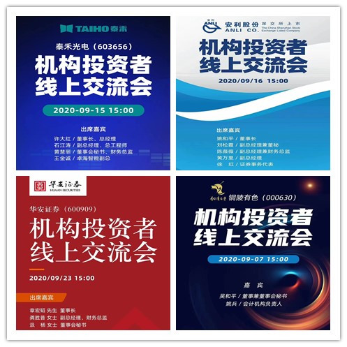 自8月底開始,轄區(qū)上市公司踴躍報名參加交流會。在不到一個月的時間里,近30家上市公司的董事長、總經(jīng)理、董事會秘書、財務總監(jiān)等高管通過在線音視頻方式就公司的基本情況及發(fā)展狀況,并就投資者感興趣的公司未來發(fā)展規(guī)劃、行業(yè)的競爭格局、業(yè)績狀況等問題進行了充分而深入的交流和溝通?!凹s調研”平臺基于4.5萬名實名認證的投資機構和分析師數(shù)據(jù)庫精準邀請1200名機構投資者參與活動,有效提升安徽上市公司在公募基金中的行業(yè)形象和地位。