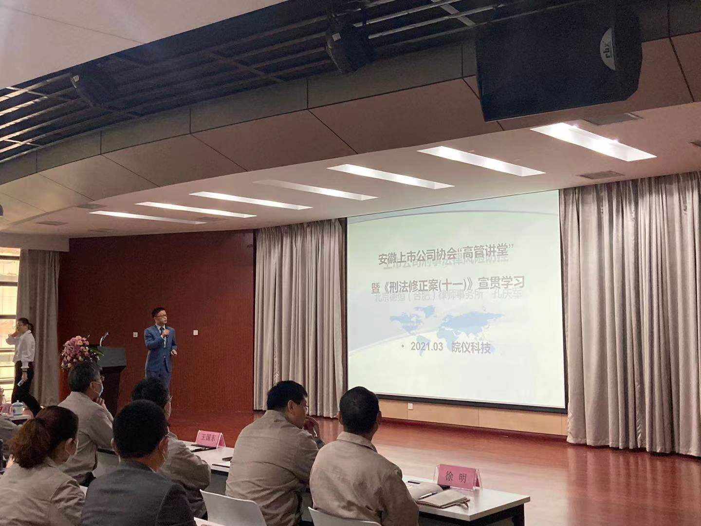 3月31日,安徽上市公司協(xié)會(huì)“高管講堂”第九講在皖儀科技舉辦。公司全體董事、監(jiān)事及公司中層及以上員工、重要子公司負(fù)責(zé)人等100余人參加培訓(xùn)。皖儀科技董事長臧牧、董秘王勝芳出席活動(dòng)。
